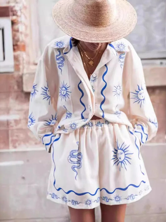Printed Casual irt Cardigan orts Two-Piece Set Women's Spring Polyester Long Sve Collar Button up