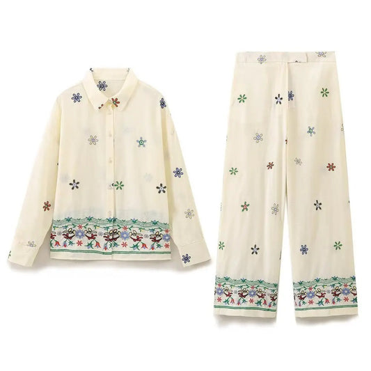 Embroidered Two-Piece Set – Shirt & Wide-Leg Trousers