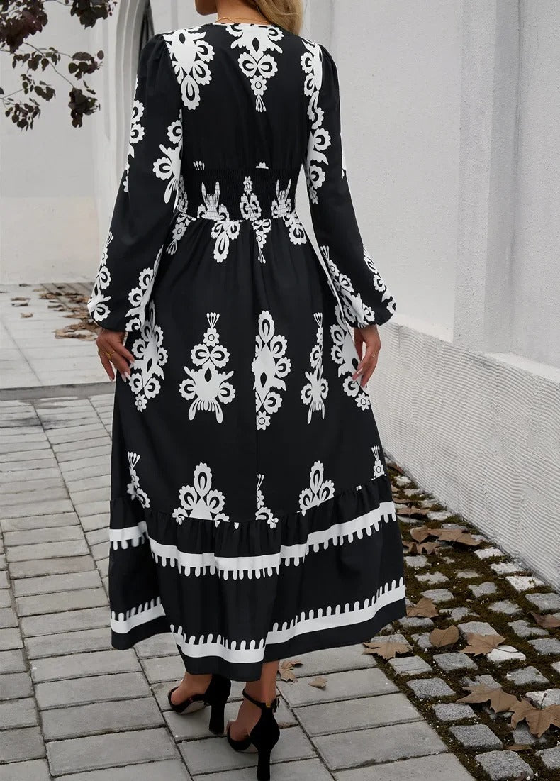 Turn heads with this stunning bohemian-inspired maxi dress, blending elegance and comfort in one piece. Its bold black-and-white pattern and flattering silhouette make it the perfect choice for both casual outings and special occasions.