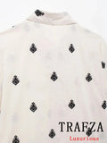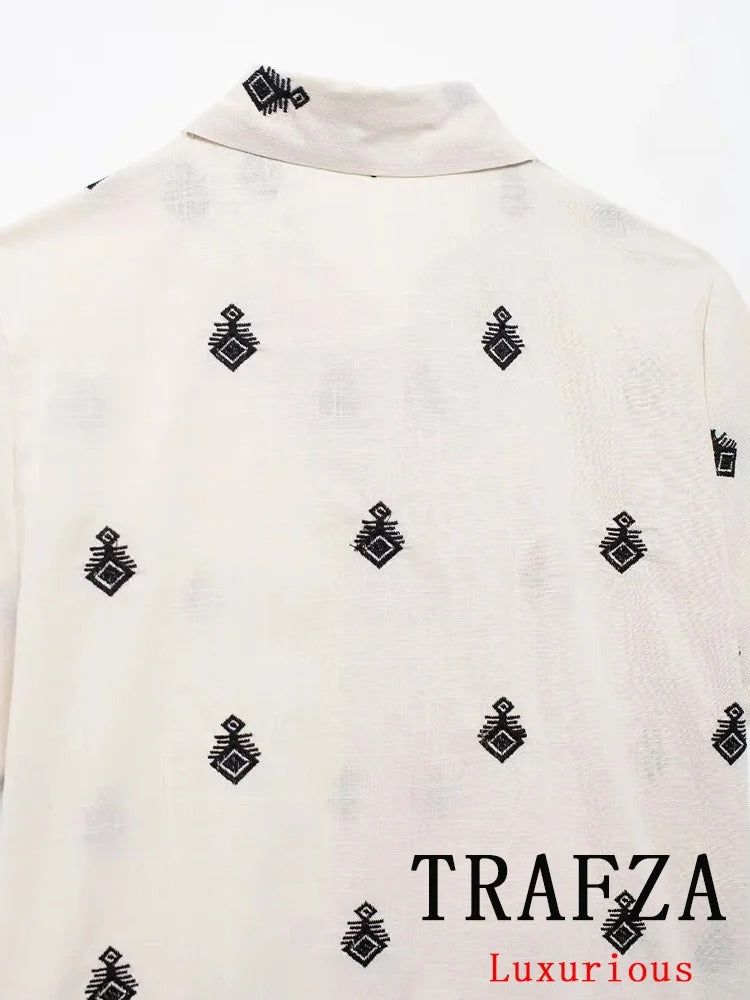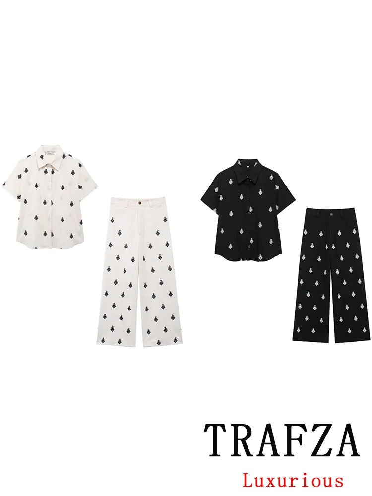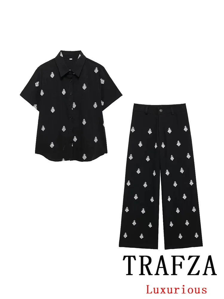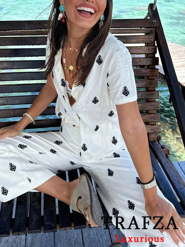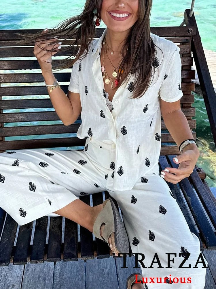 Lightweight, breezy, and stylish — this short-sleeve blouse is the perfect piece to elevate your summer wardrobe. Featuring a relaxed fit with a button-down front and unique boho-inspired embroidery, it pairs effortlessly with jeans, skirts, or the matching wide-leg pants for a complete resort-chic look.