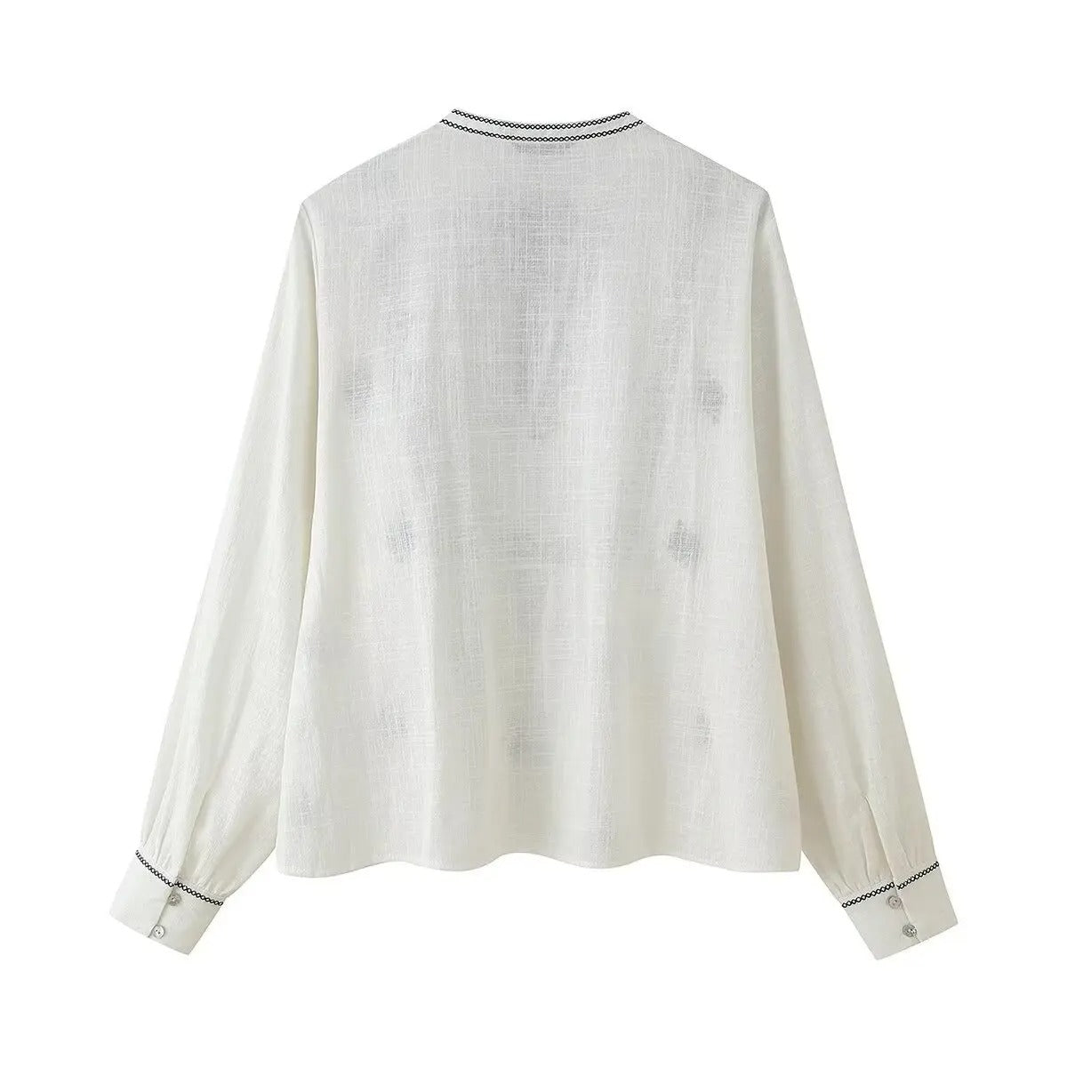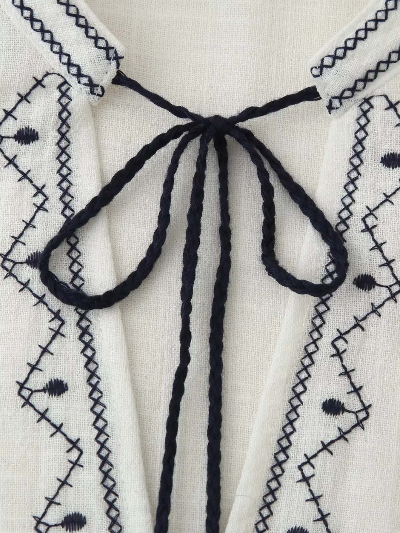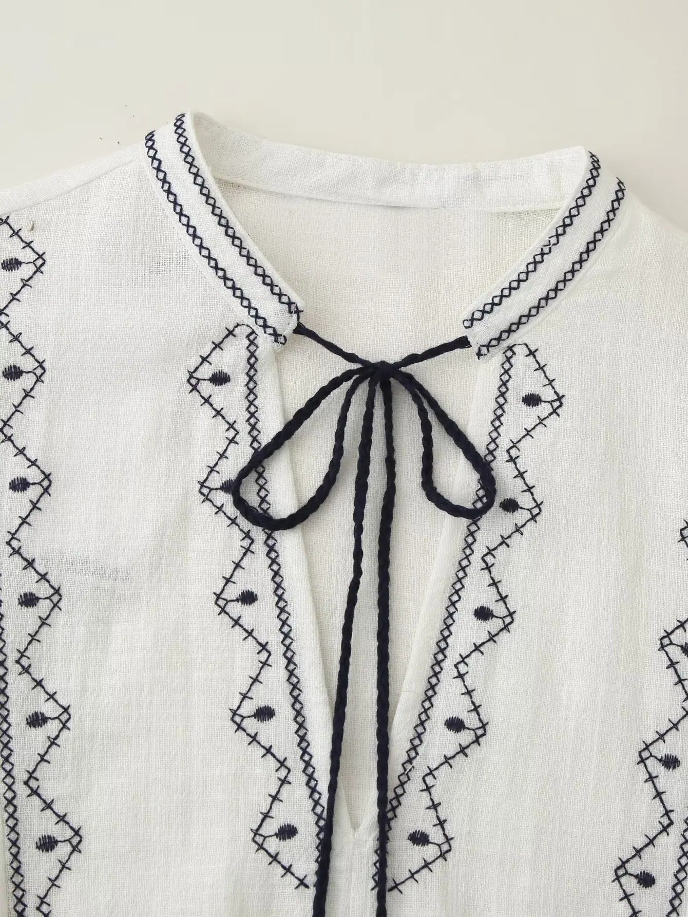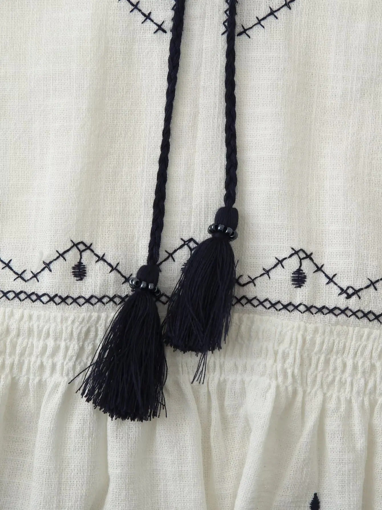 Embroidered Boho Blouse with Tassel Tie – White & Black Detailing