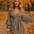Add a splash of color and free-spirited elegance to your wardrobe with this gorgeous bohemian paisley mini dress. Designed with a flattering silhouette and eye-catching details, it’s the perfect piece to make a statement while staying comfortable and stylish.