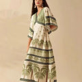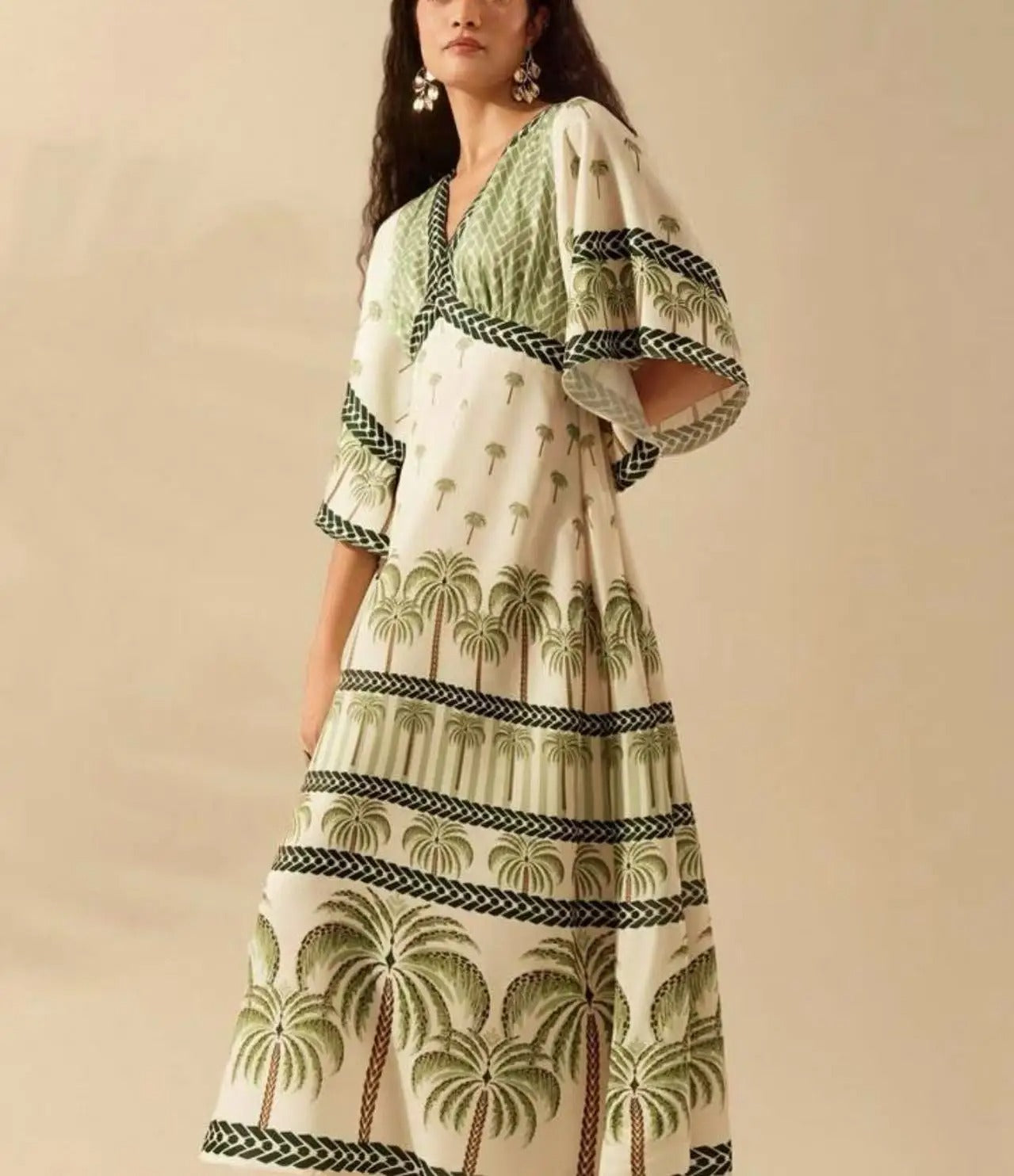 Channel tropical elegance with our Palm Tree Print Maxi Dress. Designed with a flowy silhouette and statement sleeves, this dress is perfect for vacations, beach getaways, or summer evenings. The green palm motif adds a refreshing touch, making it a standout piece for any occasion.