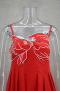 Red Maxi Dress with Artistic Fish Embroidery – Bold & Effortless